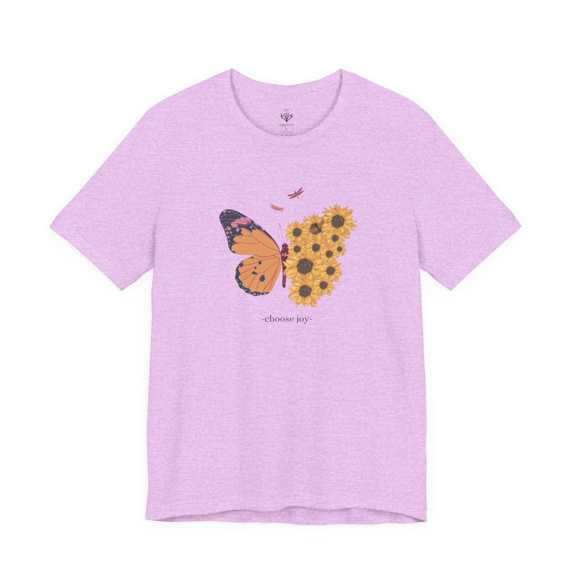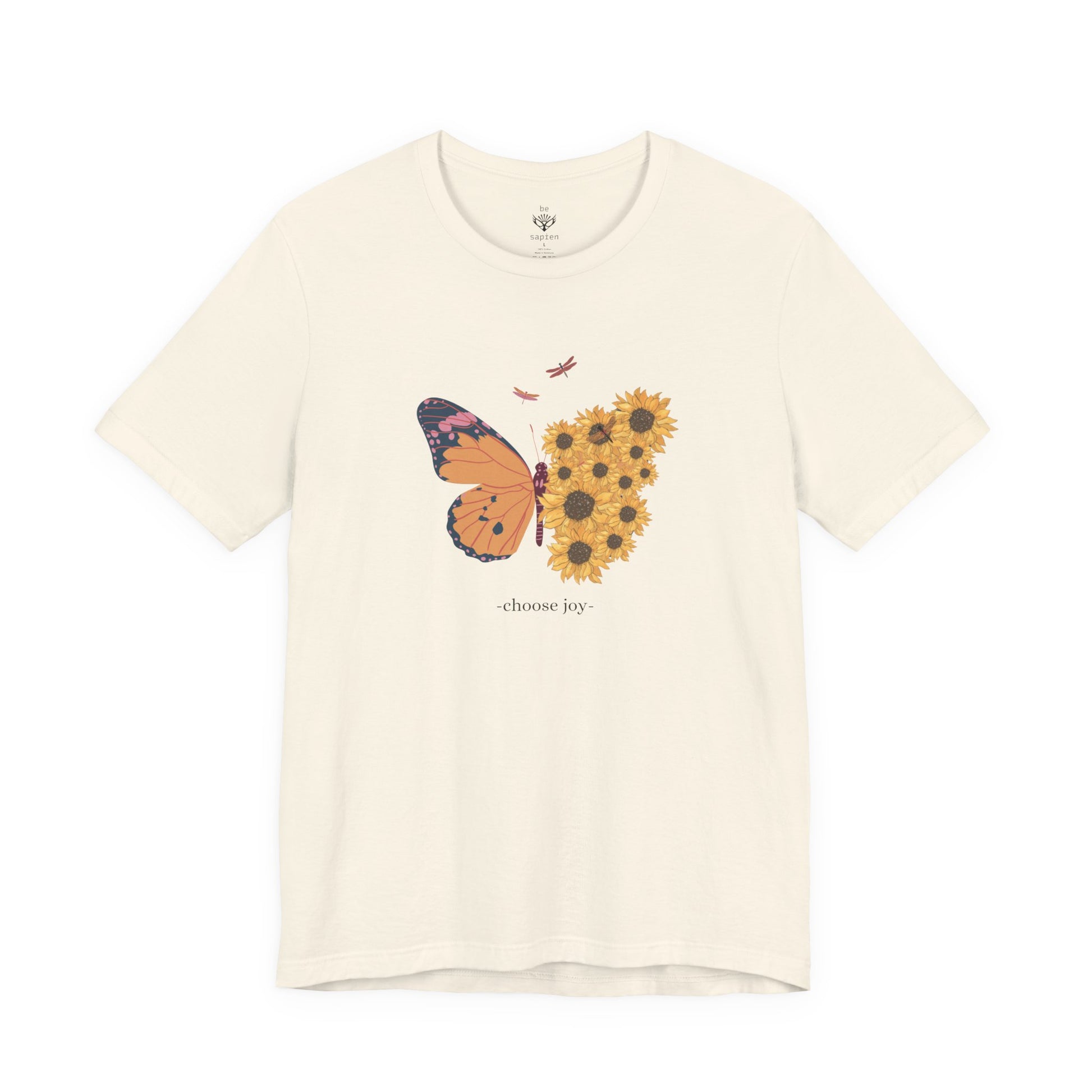 Soft, breathable tee that wears like a second skin and carries a quiet, nature-forward statement. A delicate butterfly formed from sunflowers rests at the chest — warm, optimistic artwork that feels personal rather than loud. Lightweight Airlume combed cotton gives gentle drape for layering or solo wear. The ribbed crew neck and side seams keep the silhouette neat, while shoulder tape and a tear-away label ensure lasting shape and itch-free comfort. Wear it on slow mornings with coffee, at farmers markets, or while wandering sunlit trails — it blends into calm routines and adds a small, thoughtful pop of floral whimsy.