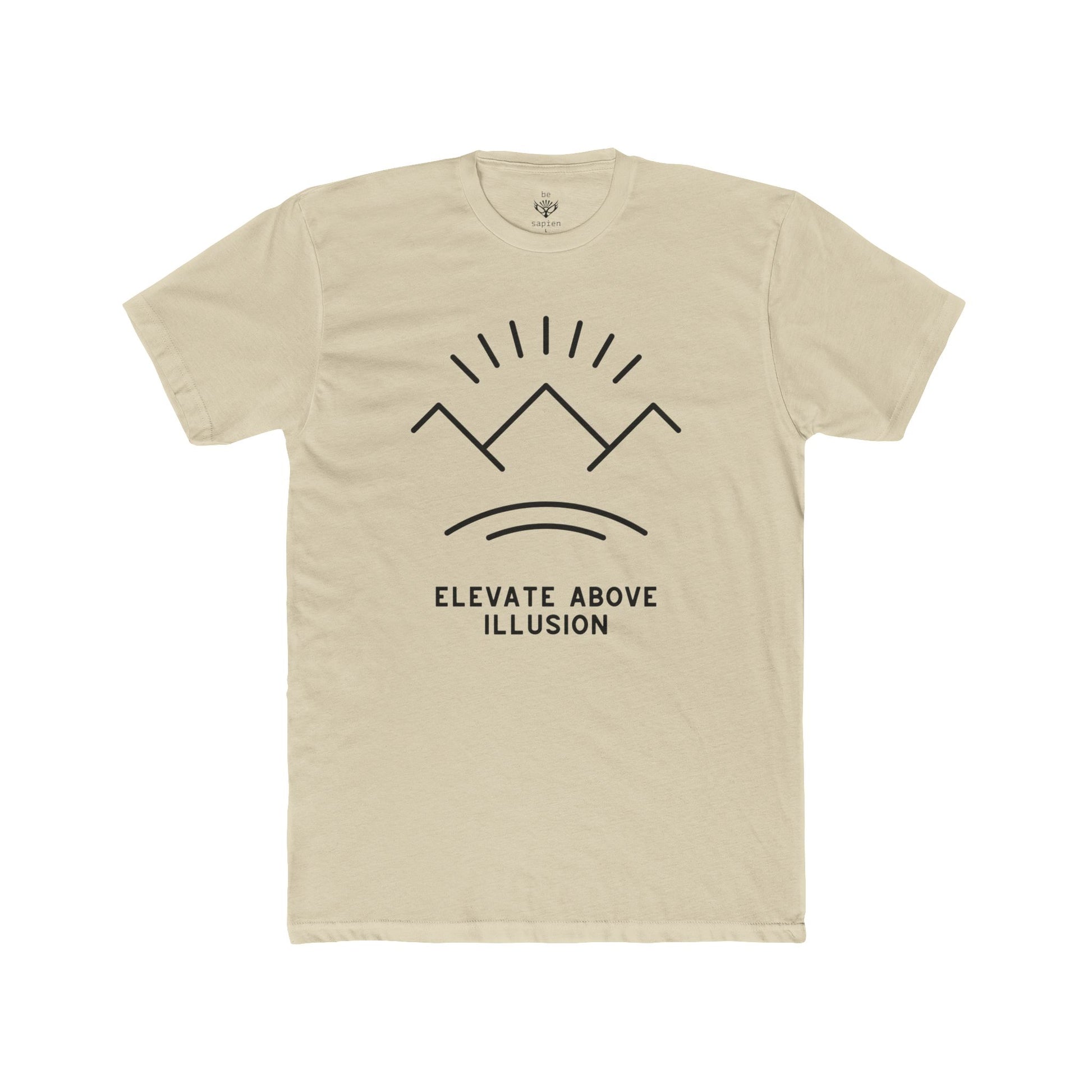 Lightweight cotton crew with a quiet, contemplative print that reads like a morning promise. Soft heather grey and simple black line art—mountain peaks, a rising sun, and the words “ELEVATE ABOVE ILLUSION”—give this tee a minimalist, mindful vibe. It sits close to the body without feeling tight, the ribbed collar and shoulder tape keep the shape steady wash after wash, and the subtle sleeve transfer adds a handcrafted touch. Wear it on slow morning walks, during weekend coffee runs, or layered under a cardigan for low-key meetups. The shirt settles into your rotation as a wearable reminder to look up, move forward, and carry calm clarity through everyday moments.
