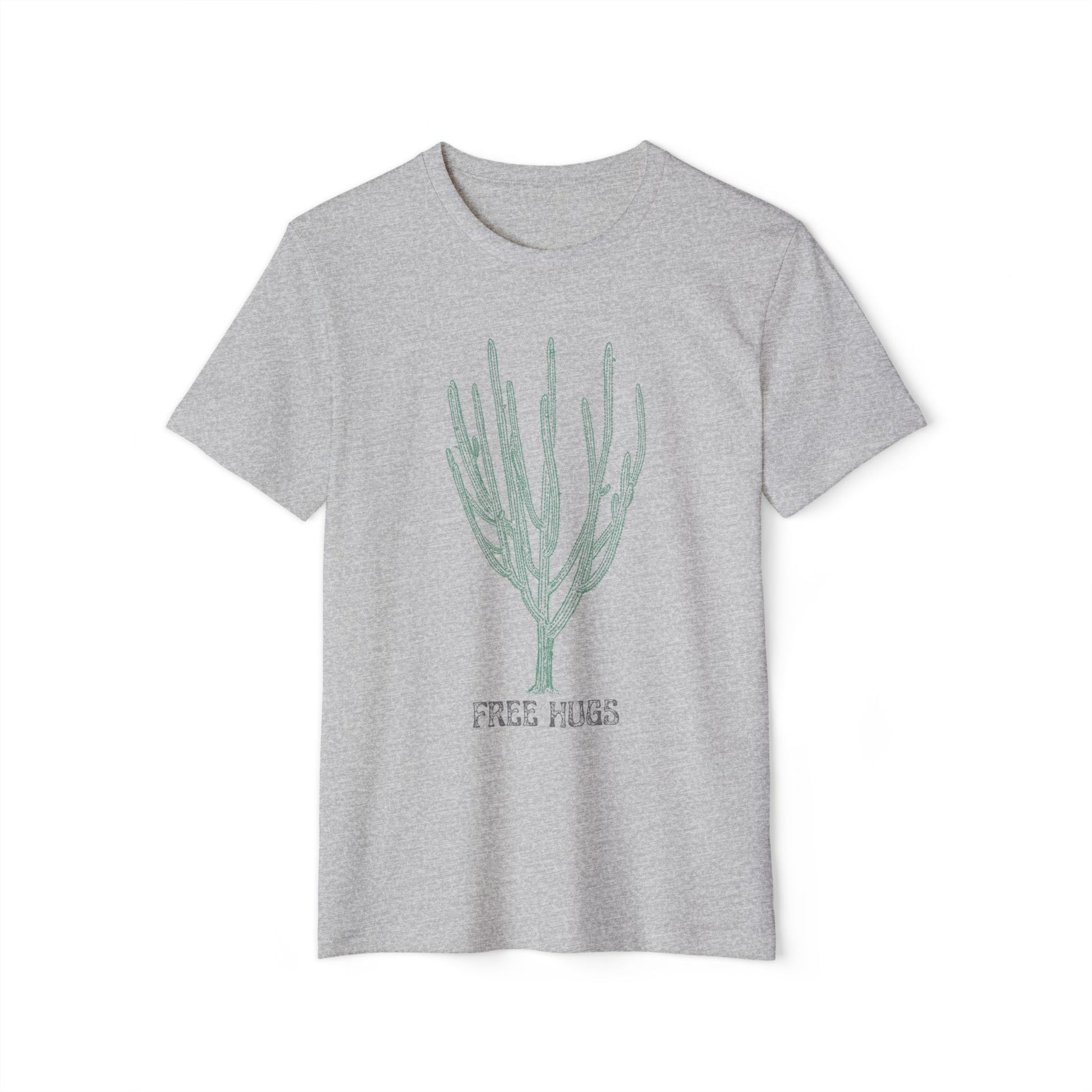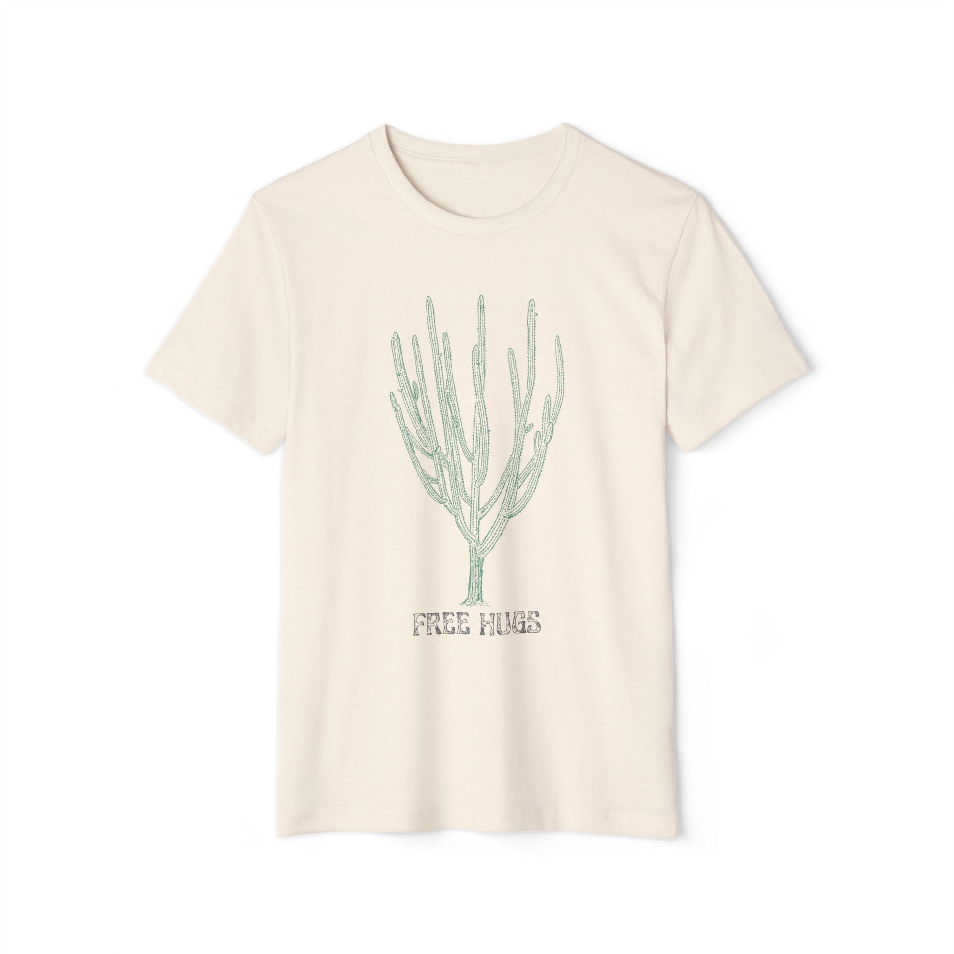 Soft, breathable, and sustainably made — this light tee carries a quiet desert spirit. A pale sage cactus print rests low on the front, with subtle hand-drawn lines and the understated phrase “FREE HUGS” beneath. The scoop-like high neckline and semi-relaxed cut create an easy, lived-in silhouette that layers well or stands alone on warm days. The fabric is airy and featherlight, yet thoughtfully constructed with shoulder tape and a tear-away label for comfort. Wear it for slow weekend drives, morning coffee on the porch, or wandering a local plant shop; it settles into everyday life and invites small moments of calm and connection.
